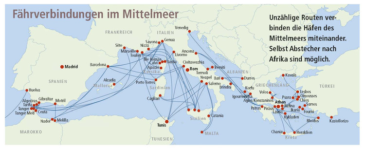 | Genua (I) - Tunis (TUN) | mehrmals je Woche | Grandi Navi Veloci SNCM/CIN |